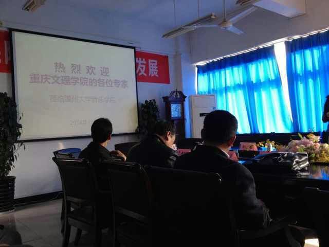 王文韬副院长主持,会议伊始,王文韬副院长以东道主的身份对我院的师资力量、学生状况等基本情况作了简单的介绍。重庆文理学院的四位老师就学校“60几位老师教1000多名学生”的现状,提出了音乐学科师资力量有待提高,以及控制学生数量、提高教学质量等相应措施,并表示在这方面应该借鉴我院。随后,对方老师又向我院老师提出了教学中存在的具体问题,我院参会的各位老师热情的解答,并同对方讨论、交流心得。最后,会议在一片融洽的氛围中结束。