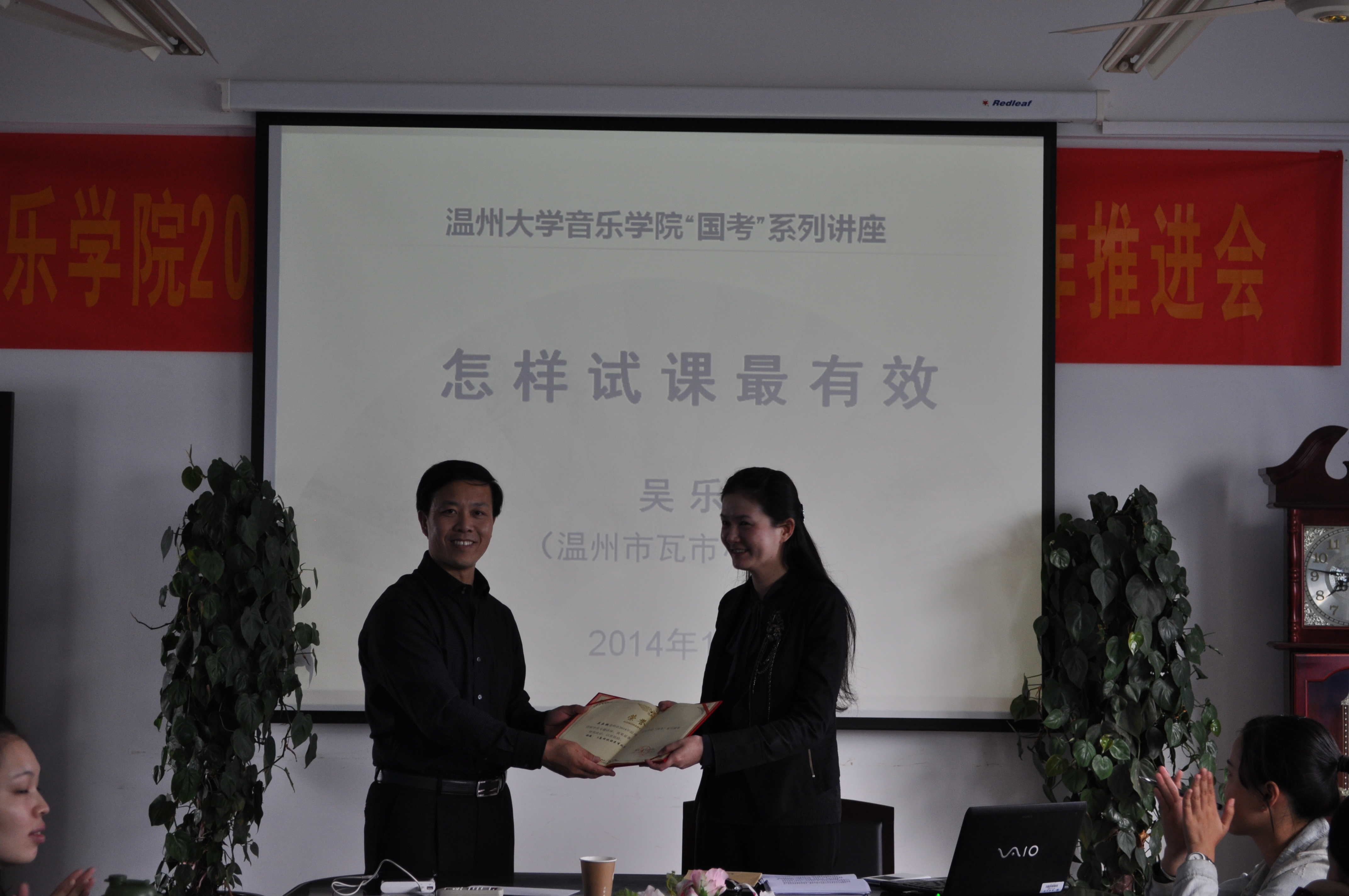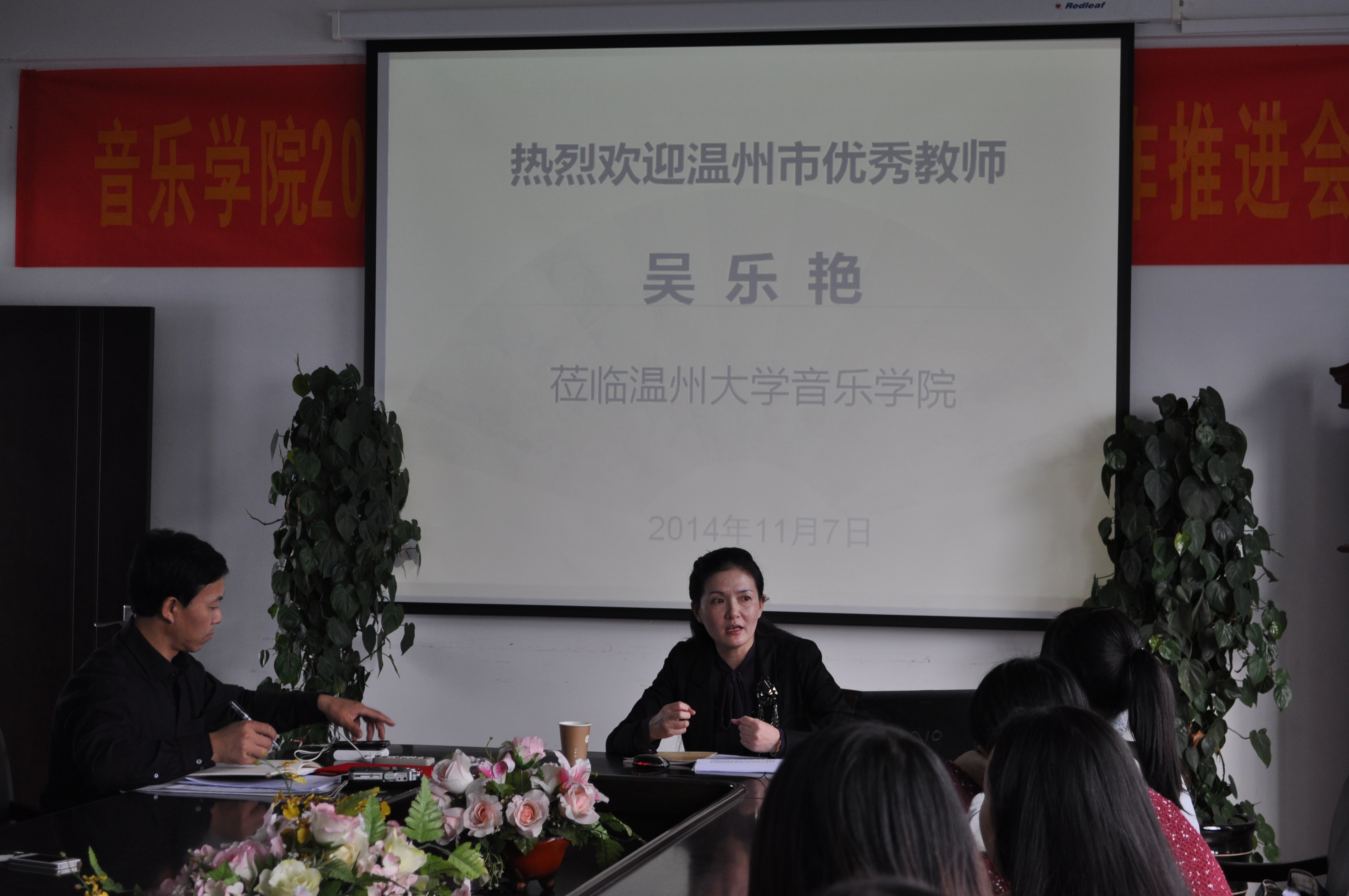 2014年11月7日下午,温州市优秀教师、教坛新秀,瓦市小学音乐教师吴乐艳莅临毒舌电影 ,指点学生“试课”的有效途径。毒舌电影 教学督导王守琢老师与毒舌电影 的同学们一起参与了交流。该活动由王文韬副院长主持。 吴乐艳老师就学生“国考”、“考编”之音乐教师国家资格考试过程中的试课环节,给予音乐学、音乐表演专业的学生有益指导。她建议应考的同学,一定要熟悉现行的各个版本的音乐教材,同时要打好“自弹自唱”的技术难关。