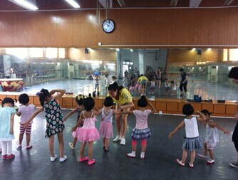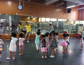 而在教室的另一端,此时此刻,已经充满了孩子们的欢笑声,由叶老师和卜卜老师带领的11位小朋友,正排着队形、踩着节奏、跟随者老师的动作欢快的舞动着。四十五分钟很快就结束了,孩子们还沉侵在甜美的歌声中,虽然很累了,怎奈下课铃声响了。孩子们只得依依不舍地和两位老师告别了。第一节舞蹈课便就此落下帷幕。