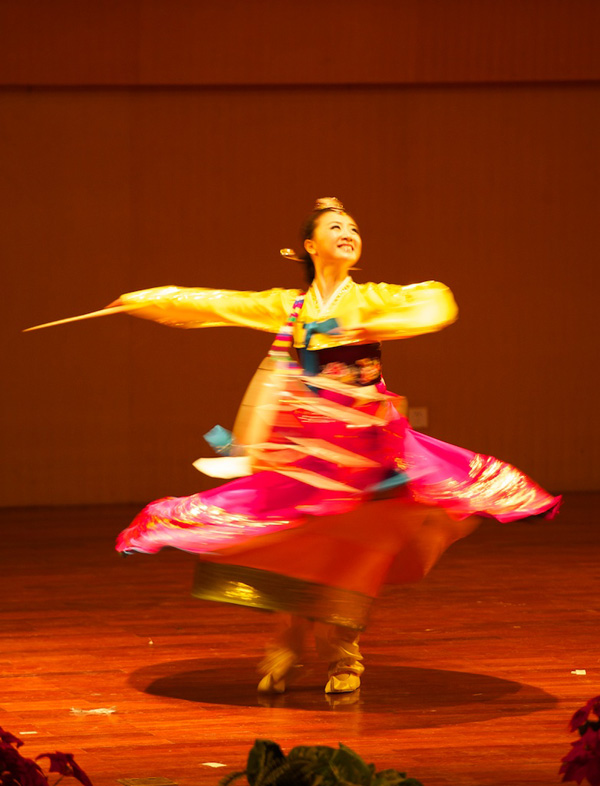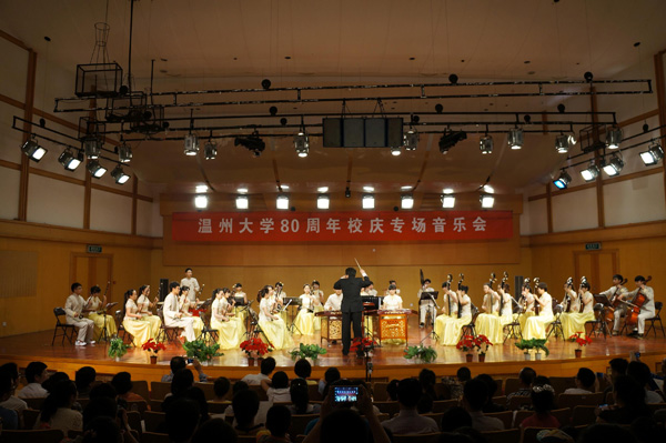 民乐团自2010年成立以来,秉持着传承经典、糅合现代的音乐理念,在艺术总监董凌凡老师、特邀指挥林韧的悉心指导下,不断通过对传统音乐作品进行改良、创新而成长壮大,已在大学生艺术展演等各类演出中多次获奖。今天所呈现的两首作品,便是对中外经典的别样演绎。我院09级研究生校友王金丹带来的女声独唱《阳光路上》,演唱柔美动听,振奋人心,颇显艺术功底。歌曲旋律优美大气,节奏流畅明快,由衷地表达了华夏儿女热情洋溢的精神风貌和阔步向前的坚定信心。陈颖、柳椰两位老师的双钢琴《蛇之吻》,以及王晓佳、胡敏、陈颖、柳椰四位老师的八手联弹《驰骋》,在极富个性、令人眩晕的演奏风格中,掀起了现场观众的热烈掌声。李恒子老师编创并表演的朝鲜族长鼓舞《涛声的节奏》,音乐古朴典雅。表演者端庄飘逸的舞姿,伴以娴熟的鼓技,时而含蓄,时而奔放,引领观众陶醉其中。而采用古筝、二胡、大提琴、打击乐配乐的表演形式,亦给人新颖、独特之感。莫颖老师演绎的肖邦《g小调叙事曲OP.23》,展现了其精湛的演奏技巧和独特的音色处理,她灵动的双手好似在键盘上自由舞蹈,激情奔放中不失细腻。舞台上的她光芒四射,散发着一种渗透到观众灵魂深处的震撼。而外教亚历山大改编的四首钢琴小品,是对经典作品的别样诠释。作品短小,给人意犹未尽之感,但却展示了其扎实的演奏功底和非凡的音乐才华。全场观众无不屏息欣赏,沉浸在他的音乐世界里欲罢不能。许天鸣老师与12级研究生张慧合作的《让我们携手同行》,情深意浓,让人回味无穷。李兵、叶文辉、许天鸣、易雄志四位老师带来的男声四重唱《森林水车》和《渔阳鼙鼓动地来》,演唱风格活泼诙谐,惹得在场观众笑声不断。而刘玉亭老师的一曲深情演唱,一展男高音明亮的音色,更温暖了在场每一个人的心。胡锦超老师诠释的小提琴独奏曲《爱的致意》旋律温婉动人,给人以甜蜜温馨之感;《查尔达什舞曲》或柔美,或激情,让人心潮难平。整场音乐会高潮不断、掌声不断。由李晓燕老师、富春雷老师、06级校友陈波、11级研究生方兴合作的《饮酒歌》,以演唱与交谊舞的结合将现场气氛推向最高潮。在全场雷鸣般的掌声中,音乐会完美落幕。演出结束后,院领导走上舞台,与演员一一握手并合影留念。