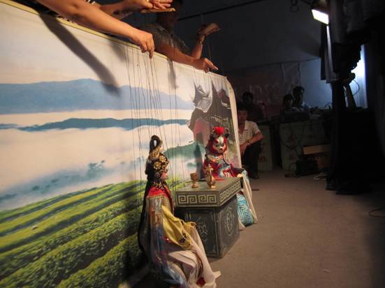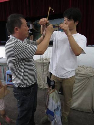 2012630日下午,我们寻美实践团队在李葳老师的带领下来到了 泰顺罗阳县木偶戏团观看木偶戏 ,正面接触了这一独特的民间技艺。我们一开始观看了木偶戏的实景表演。木偶戏艺人为我们一共表演了五场木偶戏 ,有现代宣传党中央思想的《共谱和谐篇章》,神话类的《真假牛魔王》,传奇类的《济公讲故事》,历史类《县令上任》,歌舞类的《大家一起跳起来》,演出精彩绝伦,融入瓯剧、京剧、快板、相声、歌舞、变脸等多种艺术形式,体现出艺人们高超的演绎技巧和精湛的演唱水平。节目中特别是现代与古代的相结合最为精彩,《济公讲故事》通过孩子们和济公的对话, 让我们了解了八荣八耻, 了解了泰顺的特色美景, 不仅有教育意义还对泰顺起了很好的宣传作用。后来,在演出结束之后我们被木偶戏的美和趣所吸引,不禁都想试一试。于是在老师的指导下我们大胆的进行了尝试,当我们拿起木偶时,感觉很重,一只手控制上面的面板,另一只手要操控这们多的提线,而且不同的提线要控制木偶不同的身体部位。大家体会艺人们的不易,开始尝试让木偶做动作,好几个同学被一根根线给弄怕了,手就像锈了的机器,不知如何动,而交换给艺人手中,那灵活的控线技巧,让傀儡似乎活过来。在一番不懈的努力之下,李凌翰和徐昊同学终于学会了走路与开关折扇,心中无比高兴。最后,在学习控线木偶之后,实践队员又和艺术家们在一起座谈。其中一位艺人向大家介绍了木偶戏的几个重要点:模式、音乐、服饰和技巧让我受益匪浅。而团长王景快也对木偶性的发展提出了自己的担忧,大家也就木偶戏的创新和传统继承问题上与艺人们交流讨论,很多同学都对木偶戏的发展和传承提出了自己的观点。