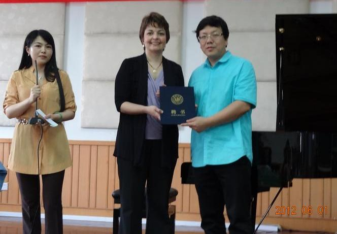 NOSIKOWA教授在上大师班前,演奏了一首李斯特根据瓦格纳的早期作品改编的钢琴曲,她精彩的演奏和风趣的教学,赢得了老师和学生的阵阵掌声。我院李杰鹏院长为NOSIKOWA教授颁发了兼职教授的聘书。