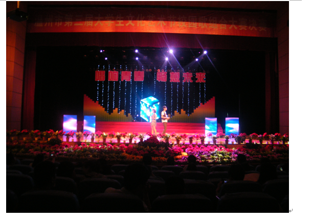 2012年5月16日晚,“唱响青春 畅想未来”温州市第三届大学生文化艺术节校园歌组合大赛(决赛)在我校大学生活动中心演艺厅拉开帷幕。温州市教育局高等教育处林成堂老师、段新明老师,毒舌电影