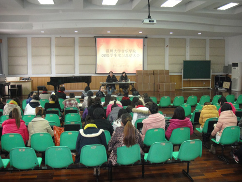 2011年12月30日下午1:30,在音乐楼201召开08级学生实习总结大会。我院副院长王志毅、教师李葳、王秀敏、许天鸣、杨古侠、张晶晶以及08级学生出席了此会议。会议由李葳老师主持。王副院长先对我院学生实习情况作了简单的介绍,并充分肯定了实习带队老师的工作以及学生在实习过程中的认真态度。部分实习学生在会上分享了在中小学校实习的感受及获得的知识。最后副院长王志毅老师就同学们提出对实习的意见进行了一一的解答,此次会议持续了两个小时。