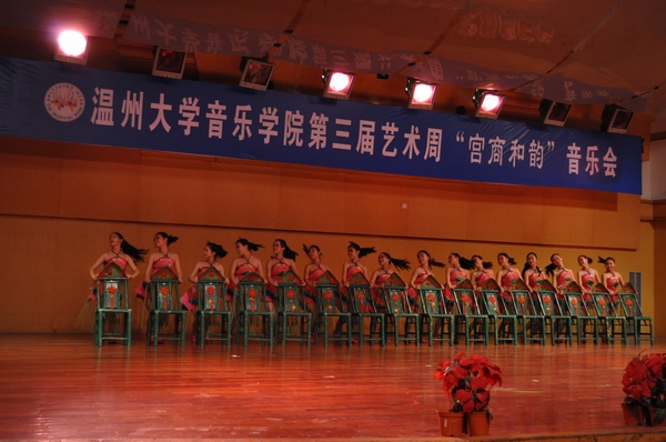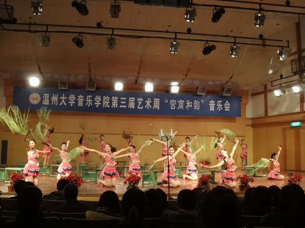 音乐会节目精彩纷呈,为大家带来了一场视听盛宴。有女声合唱、女生独唱、钢琴独奏、古筝三重奏、舞蹈、民乐合奏、双钢琴协奏、男生四重唱等10个各具特色的节目,晚会高潮迭起,此起彼伏。开场民乐团合奏《龙腾虎跃》欢快的旋律一下又把观众的情绪调动起来,引来观众阵阵掌声;古筝三重奏、钢琴独奏、双钢琴协奏等节目的演奏为同学们送上了一顿器乐盛宴,女声合唱团带来的《工尺谱游戏》、《樱花》带我们游览了音乐的街廊;男声四重唱《阿拉木汗》为整场晚会的气氛增添了不少色彩;舞蹈《竹二青,妹儿红》让人仿佛置身于舞者们之间,让人忍不住想起身共舞。藏族舞《望果》在各位舞者们的脚下,我们仿佛看到了一群藏族姑娘在跳跃在旋转,沉醉在优美的舞姿中。