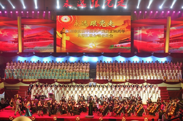 6月26日晚,红旗飘扬,“永远跟党走“温州市庆祝中国共产党成立90周年大型红歌合唱音乐会”在温州市体育馆隆重举行。我院师生近百人参演了合唱音乐会。