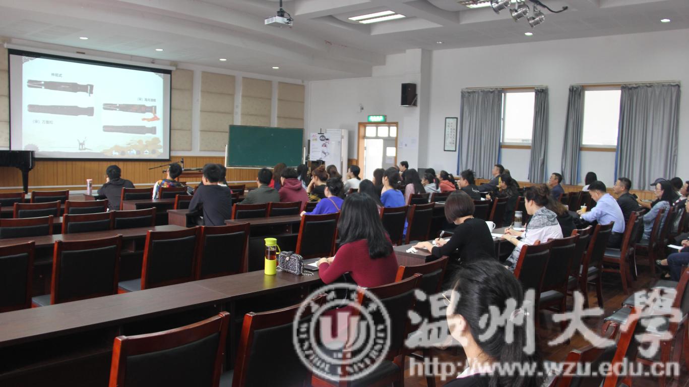 第一堂课,是张潇潇老师的"古琴课堂"。首先,张潇潇老师用幽默诙谐的方式为大家演示了影视剧中几个错误的古琴演奏片段。紧接着,张潇潇老师又列举了许多古琴的正确的演奏方式、派别以及乐曲的创作历史背景等,以此来告诉大家,每一门乐器都是一种文化,在学习乐器的过程中,不能只固守其表学习技巧,更重要的是了解乐器背后的历史文化。为了让大家能够更加真实的感受到古琴魅力,张潇潇老师为大家献奏乐曲——关山月。音韵朴实、自然,让大家沉寂在古风韵律之中,仿佛带大家穿越回古代,享受山水之间、自然之美。之后,张潇潇老师又为大家讲解了"减字谱"的演奏方法并为大家带来了乐曲片段——沧海一声笑。演奏完毕后,同学们跃跃欲试,张潇潇老师邀请学生上台,指导学生演奏古琴。第二堂课,是由钟芳芳老师带来的"茉莉花&阿里郎"。首先钟芳芳老师列出了两首歌曲的乐谱,让大家对两首歌曲有了一个初步了解。紧接着,钟芳芳老师先介绍了各地域不同版本的茉莉花,虽然各有差异,但却相互联系。这说明各地域文化百花齐放但都围绕在中华文化的主干周围。然后,钟芳芳老师又为大家讲解了歌曲——阿里郎,同学们在下面打节奏,钟芳芳老师在台上演唱。演唱完毕后,又为大家带来了阿里郎演唱的影视资料,切身体验阿里郎的魅力。第三堂课,是由陈露雯老师带来的"钢琴演奏中的点与线"。陈露雯老师邀请学生上台,并指导学生弹奏各种节奏型以及不同调式的音阶,在老师的精心指导下,学生弹奏地越来越熟练。在进行完音阶练习后,同学为大家弹奏了舒伯特即兴曲,老师对其演奏曲目进行了一番指导,之后同学再一次演奏,与之前的演奏感觉大不相同,有了明显进步。