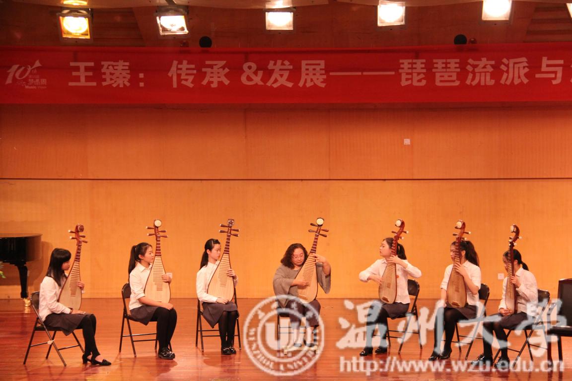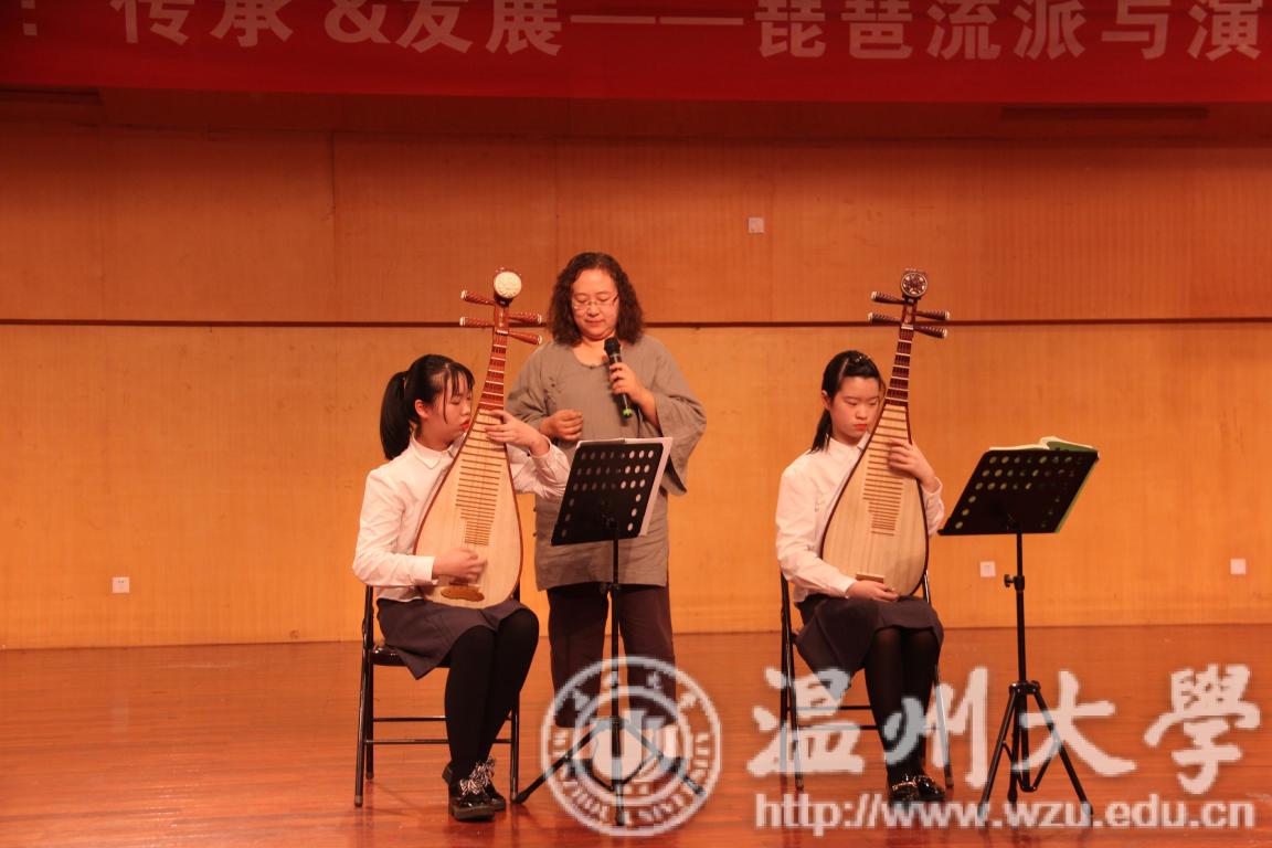 附中学生演奏了《金桥勒马》、《一马双驼》等七首乐曲。然后,王臻教授分别为观众们介绍了“江南丝竹”和“广东音乐”中的琵琶,上海音乐附中的学生还为观众们示范了其中的技巧,“ 金焱”琵琶组合为观众们演奏了《原版三六》、《评弹印象》等。