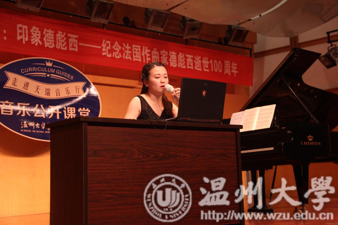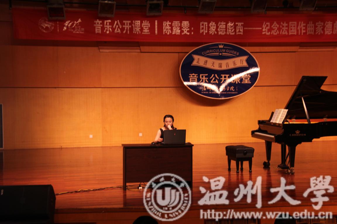 2018年11月12日,下午7点,音乐公开课堂印象德彪西——纪念法国作曲家德彪西逝世100周年在天瑞音乐厅准时开始(德彪西(1862-1918)法国著名作曲家,第一个印象派作曲家)。陈露雯老师是旅美钢琴女博士,克利夫兰国际音乐节创办人之一。