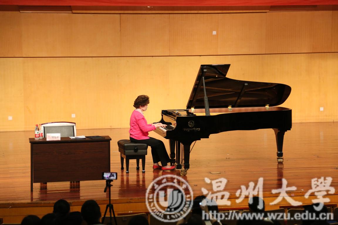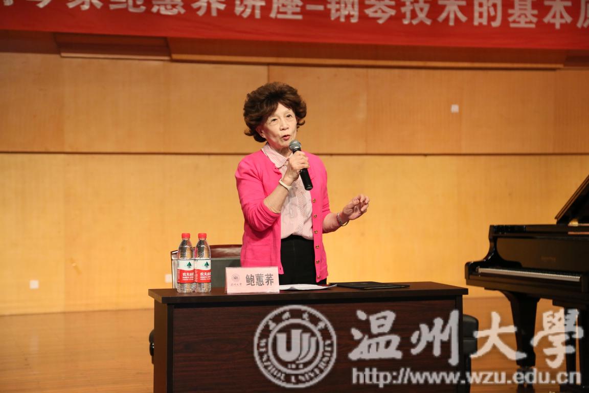 首先由赵玉卿院长为鲍蕙荞老师颁发了客座教授聘书。鲍蕙荞老师表达了对温大师生的感谢,随后便开始了主讲。首先鲍老师提出学习钢琴是一个漫长的过程,提出要脑子思考,意识与听觉相结合的观点,着重讲解了对神经的训练,强调意识在前,要让听觉引领练习,演奏。鲍蕙荞老师结合自己的亲身经历与经验,告知师生们所有的演奏,首先要了解乐器的基本原理,再由浅入深。紧接着鲍蕙荞老师提出技术与发音的原理密切相关的基本原则,分别从下键的高低,力度,速度,角度,横向移动,旋转式移动和手指移动的部位等方面进行阐述。鲍老师着重对于入门时需注意的各方面进行了详细的讲解,从身体协调性,坐姿,自然与放松等方面展开阐述,并提到了我们要利用当前庞大信息量的优势,针对当前浮躁的问题,强调了要由浅入深,循序渐进的重要性,并提出作为一名钢琴老师不要急于造星的观点。随后对“练习曲要不要每一条都弹”的问题进行剖析,鲍蕙荞老师的回答是基本上都要弹,并且要科学的弹。鲍老师将学习过程比喻成建造房子的过程,只有把各个技术环节搞明白,先慢后快,打好地基,最后才能建造出美丽的房子,最后鲍蕙乔老师提出高抬指训练是一种方法,手段。分别从慢练,启动快,下键速度即触键速度快,还原快即放松快等方面进行了详细的阐述。最后,讲座在鲍蕙荞老师的寄语中完美落下帷幕:希望各位师生在掌握基本原则后,结合自身情况,钢琴水平得到提高。
