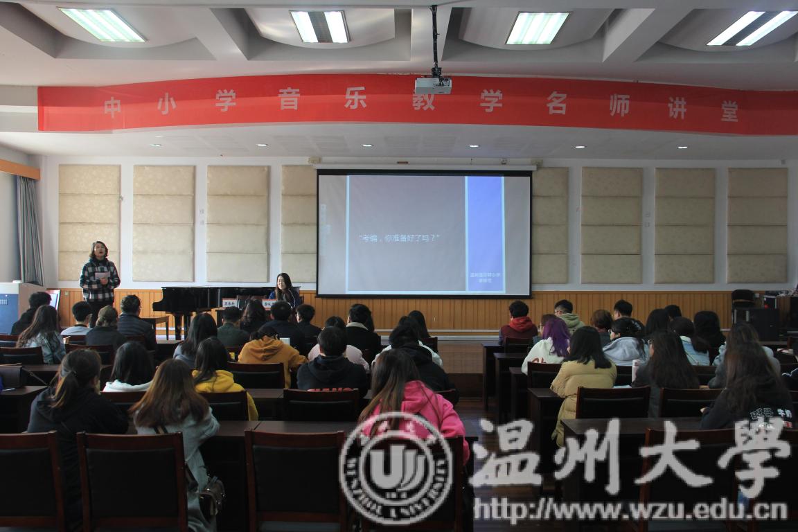 3月26日上午,由温州市道尔顿小学李咏雪老师主讲的音乐名师课堂《分条析理 娓娓道来—音乐学科面试策略解析》在音乐楼201报告厅举行。教学副院长王文韬、实习指导老师李葳以及教学科相关人员出席了讲座,卓越师资培育中心主任吴春艳主持、16级、17级、18级全体学生参与学习。