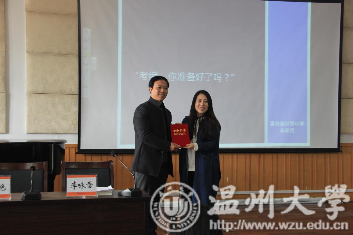 首先由副院长王文韬老师为李咏雪老师颁发了音乐名师证书。讲座上,李咏雪老师先介绍了什么是考编,考编分为笔试和面试,其中笔试又分为基础知识和专业知识考试,面试又分为说课试讲等。紧接着,李咏雪老师向在座的同学们提了一个换位思考问题:学校需要什么样的老师,同学们踊跃发言、各抒己见。