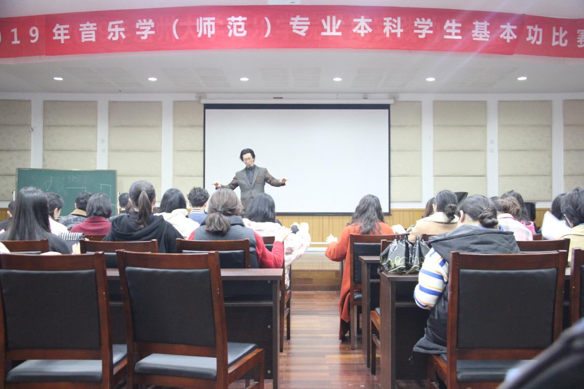 首先,叶文辉老师与大家分享了关于“2019年音乐学(师范)基本功大赛”的一些心得,也指出了同学们普遍存在的一些问题以及今后在指挥中同学们需要注意的一些事项。例如:在指挥中,同学们速度过快或过慢,忽略了某些速度、力度记号等。这些看似细小的问题往往都是十分致命的,可能会因为与原谱出入过大,从而导致与整首作品的情感和作者表达的意思背道而驰。紧接着,叶文辉老师为大家解析了“2019年音乐学(师范)基本功大赛”中的作品《半个月亮爬上来》合唱谱。每一个声部、每一个乐句、每一个记号都解析的十分透彻,没有放过任何一个细节。在合唱指挥手势上,叶文辉老师也是“一招一式”的为同学们演示,为了能够让同学们了解的更加透彻、全面。