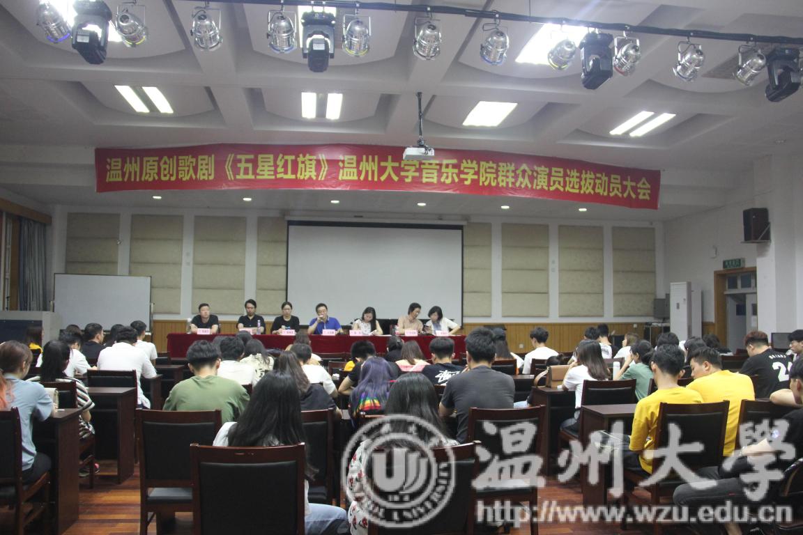 首先,我院党委副书记蔡晓武老师发言,蔡书记为大家简单介绍了温州原创歌剧《五星红旗》的创作背景、意义,以及《五星红旗》背后的真实故事。歌剧《五星红旗》是一部爱国歌剧,为了能够使歌剧更加精彩完美的演绎,《五星红旗》歌剧的创作融合了一批优秀的词曲作者,创作的阵容十分强大。可以说这部原创歌剧融合了许许多多的心血,意义非凡。接着,我院副院长蔡军老师发言,蔡院长为大家介绍了"群众演员"的意义以及给予的一些奖励,以此来鼓励大家踊跃报名、尝试参与歌剧的演出。显然,许多同学们已经显得跃跃欲试了。随后,叶文辉老师对接下来的选拔和排练安排做了讲解,同时再一次强调了本次选拔的意义,同时也为我们能够有如此好的机遇而感到高兴。歌剧,可以说是声乐艺术学习的最高殿堂,是每个人都无比向往的神圣殿堂,能够亲眼见证,甚至亲身参演原创歌剧《五星红旗》的诞生以及发展,这对我们来说是十分幸运的。动员大会的最后,是我院党委书记朱启鑫老师总结讲话,朱书记表示,原创歌剧《五星红旗》,是检验温州市文化底蕴的一战,同时也是检验我院整体水平的一战,希望全院师生能够齐心协力,打好漂亮一战!发言完毕后,同学们便开始了紧张的选拔。
