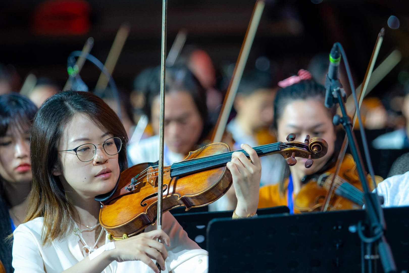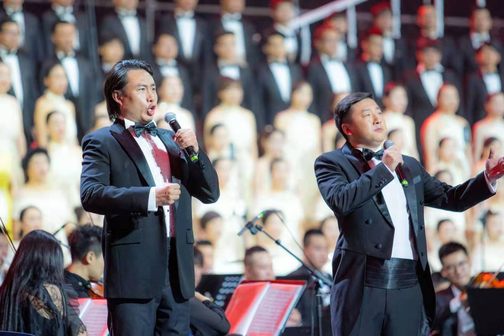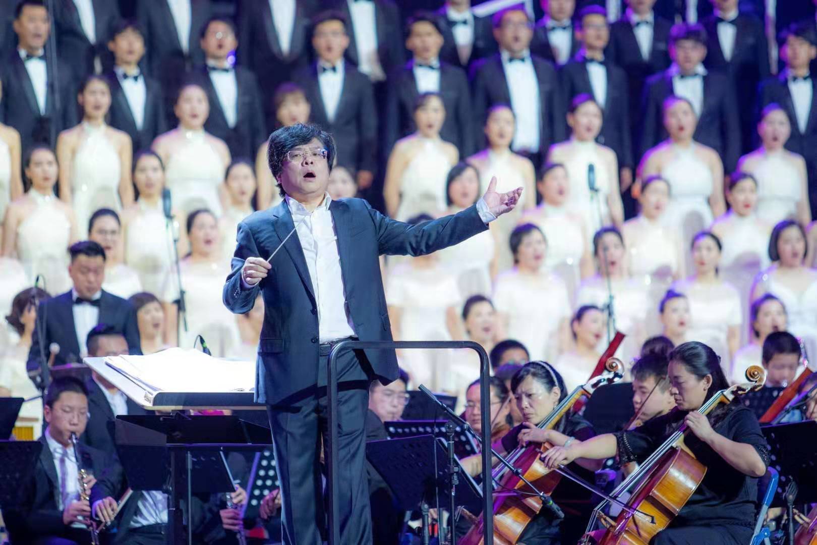 院长邹跃飞领衔,担任整场歌咏会的艺术总监。他还是现场百人乐队指挥,豪情满怀,用精准的挥拍带领全场高歌颂中华。