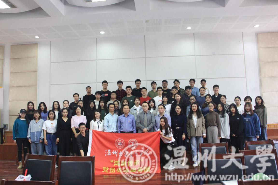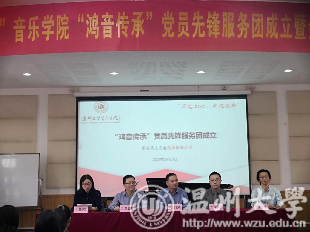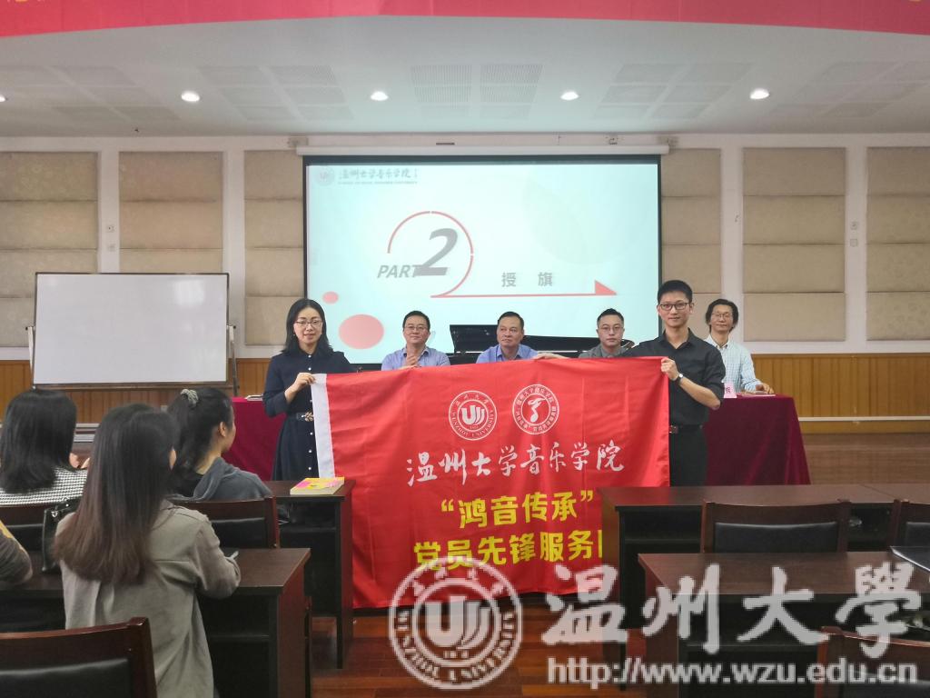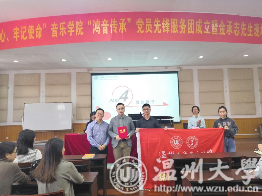 首先,由副书记蔡晓武介绍了到场的领导与老师:潘玉驹,朱启鑫,叶文辉,以及我们本次特邀嘉宾金承志老师。本场活动内容共分为五个部分。第一部分内容是党委书记的发言:党委书记朱启鑫对党员先锋服务团的组成进行了简单的概括,它是以党员和积极分子为主体的一个特色团体。紧接着强调了服务团的宗旨,提高学生的专业能力, 同时把红色经典发扬光大。第二部分内容是授旗:在座领导共同为党员先锋服务团进行授旗仪式,当团长接过旗帜的那一刻,内心必然无比的激动。第三部分内容是团长的发言:团长由18音研郑百川担任,这是一个多么光荣有艰巨的任务,但是从他的发言当中无不透露着喜悦与对服务团未来的展望。第四部分内容是颁发聘书:我院荣幸请到温籍青年指挥家、作曲家金承志来担任艺术指导这一职位。各位领导共同为金承志、叶文辉老师颁发聘书。第五部分内容:校领导潘玉驹的讲话,潘老师首先对我院歌剧《五星红旗》做出了高度的评价,希望我院能把团名片擦的锃亮,希望能成为促进温州各方面发展的一张名片。