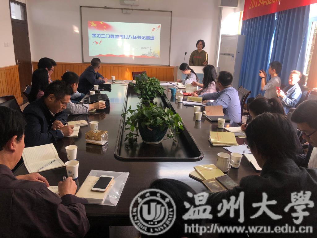 教工第二党支部书记柏互玖带头学习习近平总书记在文艺工作座谈会上的讲话,以《新时代中国特色社会主义文艺的行动纲领:习近平文艺座谈会讲话精神的时代意义》为主题,从实现中华民族伟大复兴需要中华文化繁荣昌盛、创作无愧于时代的优秀作品、坚持以人民为中心的创作导向、中国精神是社会主义文艺的灵魂以及加强和改进党对文艺工作的领导五个方面展开探讨学习。随后,由本研联合学生党支部书记林海红带领全体党员深入学习了三门县城西村八任书记一任接着一任干先进事迹。
