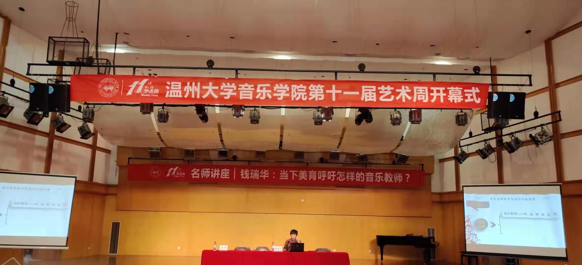 艺术周以钱瑞华讲师为大家开堂讲座作为开场——"当下美育呼吁怎样的音乐教师?" 钱瑞华老师是温州市教育教学研究院音乐教研员,浙江省特级教师、温州市名师,中央毒舌电影