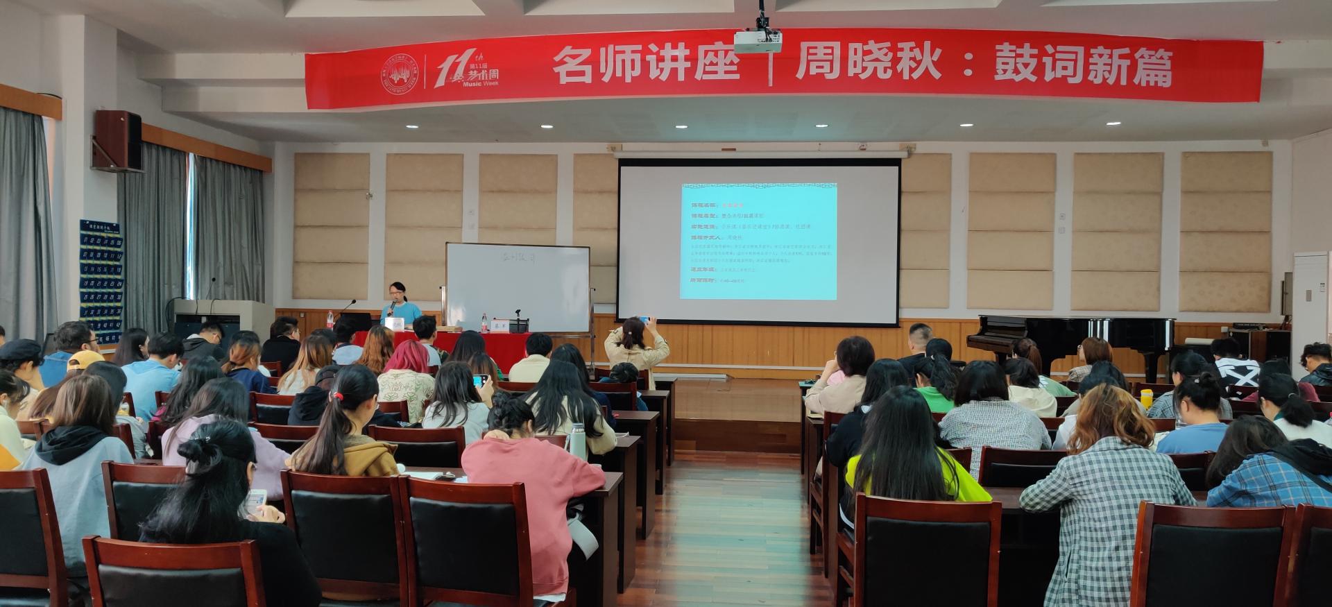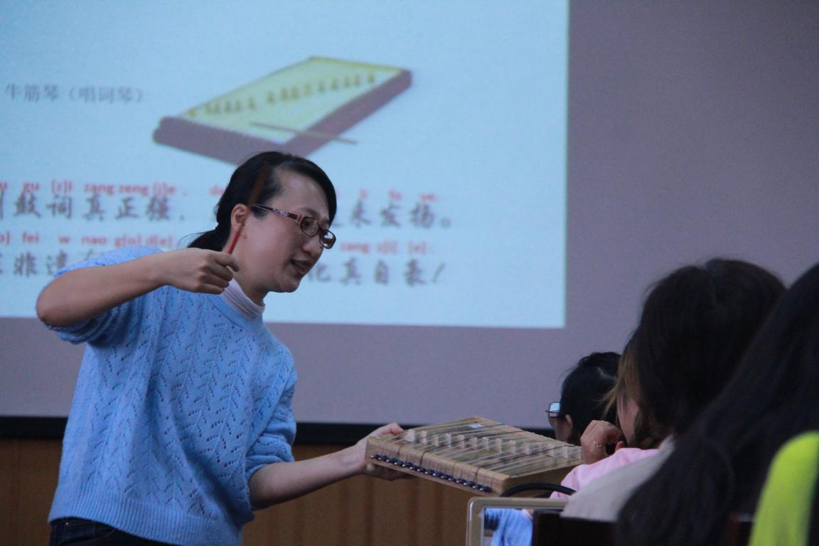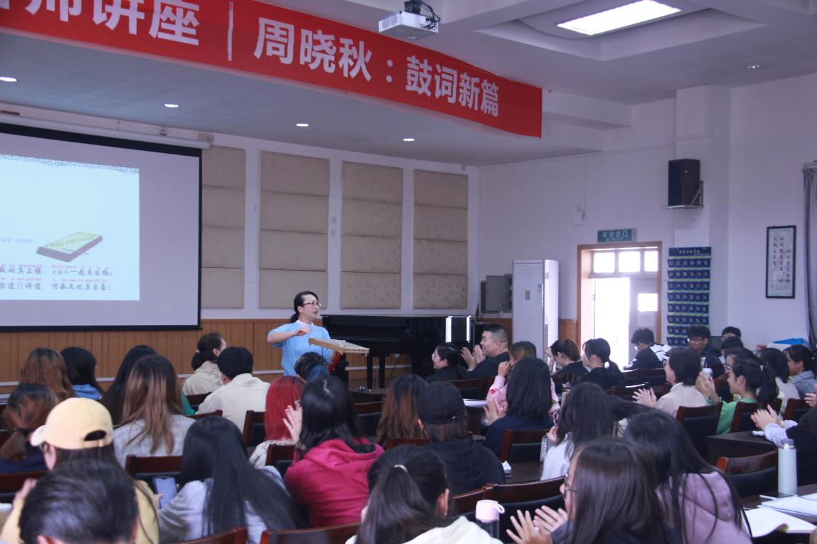 在欢悦的气氛和热烈的掌声中,周晓秋老师开始了她精彩的讲演。首先,周晓秋老师强调了初心,热爱音乐是让她能取得如今的这些成就的原因,希望各位同学也能一直保持初心,砥砺前行。周晓秋老师详细向我们介绍了温州鼓词。温州鼓词,具有浓厚的地方色彩和独特的艺术风格,同时也被列入第一批国家级非物质文化遗产名录,同学们在潜移默化中对温州鼓词有了一些初步的认识。紧接着,她以说课的方式,为我们上了一堂生动有趣的鼓词入门课。用贴近我们现代生活的几个视频,激发我们学习的兴趣,自然而然地引出温州鼓词的特点——说唱结合,一人多角,内容口语化,七字为一句等等。周晓秋老师还专门带了自己改良的伴奏乐器并亲自演奏了一段自编的鼓词,同学们都被深深地吸引住了,在她的传授下,同学们轻松的初步学会了如何演奏牛筋琴,牛皮扁鼓,三粒板这些鼓词伴奏乐器,讲座的最后,周晓秋老师阐述了自己的教学理念,她提出,音乐学者应该要成为一个连接传统与现代学生的桥梁,温州鼓词并不是我们想的那么古板,无聊,在不断创新与发展的过程中,它已经可以被大多数人接收并被喜爱。从感性到理性,让温州鼓词能更好的传承下去。没有创新,何来发展,但创新不意味着抛弃传统,要在传统的基础上添加现在时代的因素。就如她唱到的“温州鼓词真正强,大家一起来发扬”。