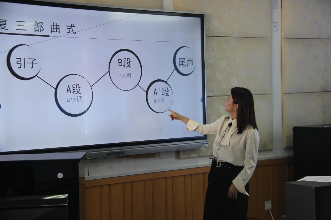 陈露雯老师为大家带来的钢琴课堂的主题是调性听觉的培养与运用。首先陈老师以大小调音阶的对应为切入点,与同学们一起演奏了大调以及与之对应小调的转换,其次由学生进行展示演奏《塔兰泰拉舞曲》,急促、强烈的节奏活跃了现场的氛围,让这个课堂听起来不乏趣味,老师的曲式分析分别为复三部和奏鸣曲的曲式分析,让大家更加清晰的了解到钢琴曲的整体脉络和分段,讲课以师生合奏训练《小调的重奏》为最后一部分,老师循序渐进的合奏给大家带来了听觉上的完美享受。