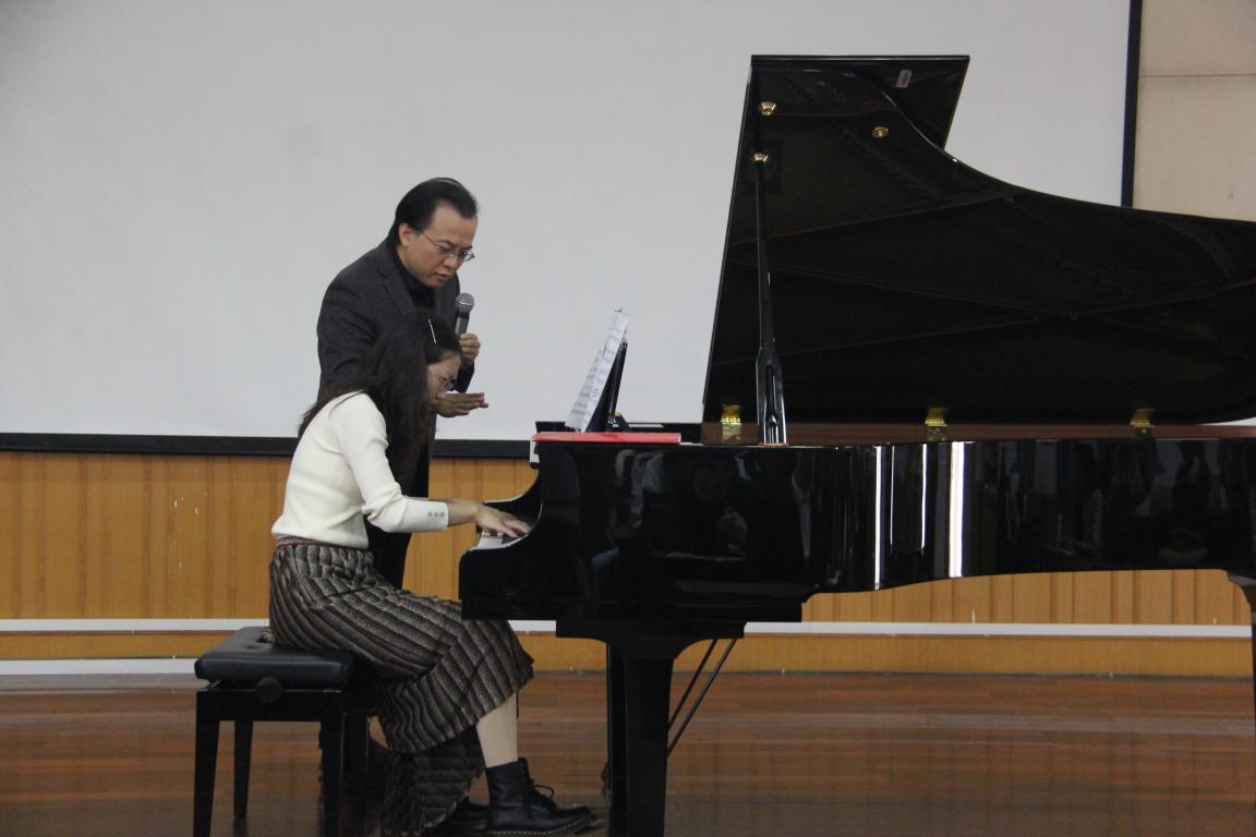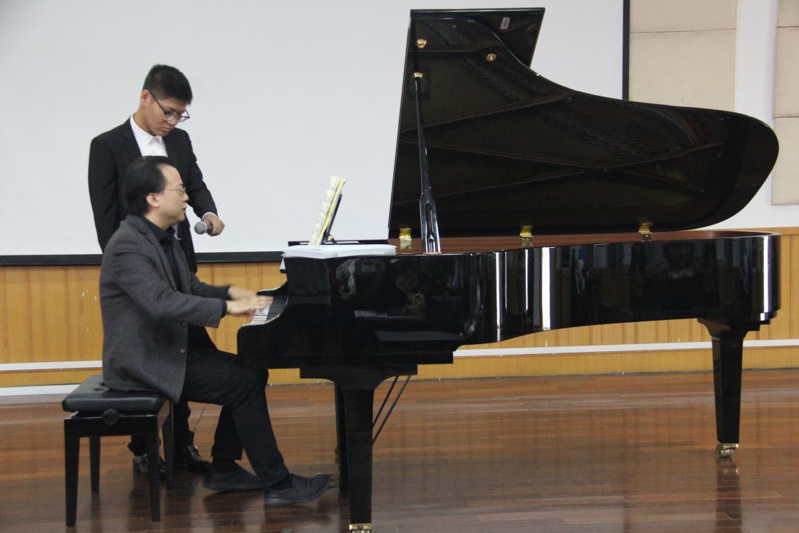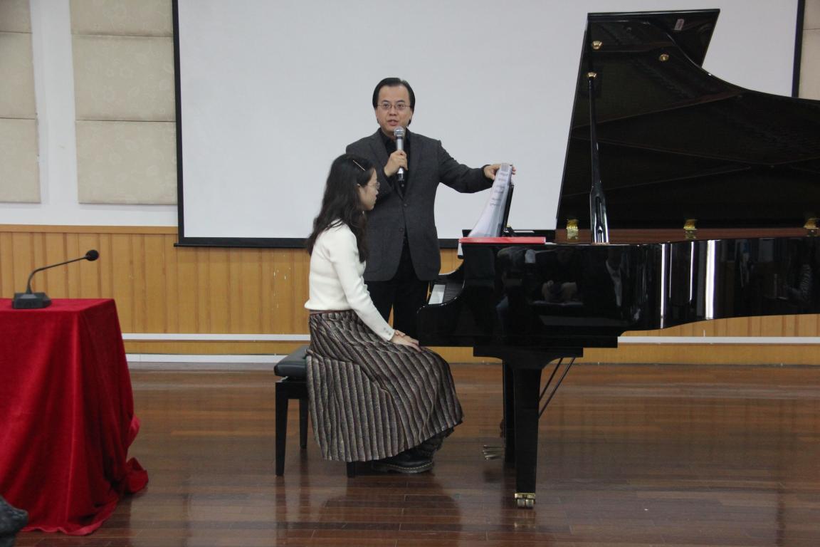 “钢琴演奏与文学”博士。曾多次在国际重要钢琴比赛中获奖,包括挪威格里格国际钢琴比赛银奖、美国芝加哥肖邦钢琴比赛第一名、威尔士国际钢琴比赛第二名等。并在欧、美、亚及中国国内各地进行音乐会演出、大师班等活动,与他合作演出过的著名指挥家包括美国克利夫兰交响乐团的Jahja Ling等。讲座开始,由我院的学生弹琴,唐教授在一旁指导。其中有我院学生徐梦婷弹奏的张帅《三首前奏曲》和袁新凯弹奏的《革命练习曲》。在学生弹奏出现问题时,唐教授会悉心指导,方式生动有趣,也会身体力行亲自示范。不由让我们在尊敬唐教授的同时又觉得亲切。