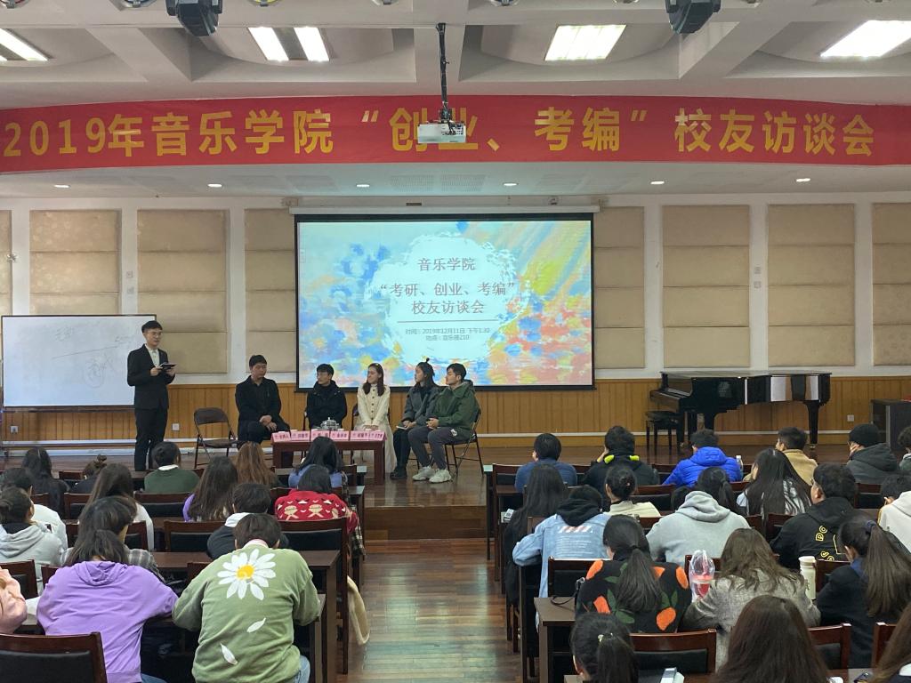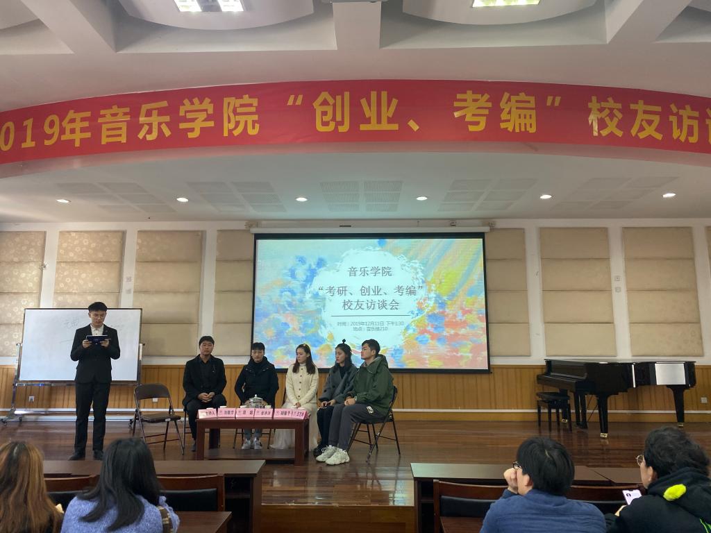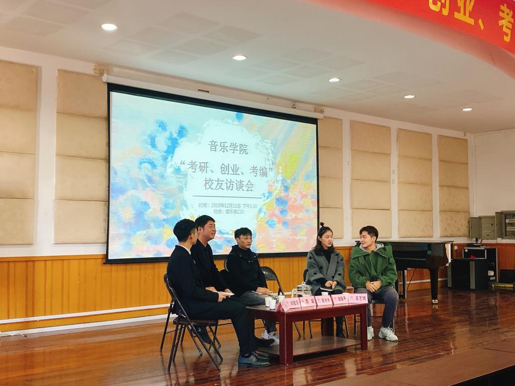 其次由刘敬芳学长为我们分享他的创业故事,学长也提出专业要扎实,创业所面临的问题会更多,所以付出的努力也更多。创业是不容易的,学长说到创业前要做好准备,专业知识要过硬,人生规划也要清晰,最好是边工作边创业,去积累工作经验,学会与学生家长打交道,才有资本去创业。接着由周超学长给我们分享了他的故事,周超学长也说到,在大学要有一个清晰的,同样教学也很重要,三分靠内容七分靠表演,让学生真真切切的体会到音乐魅力。
