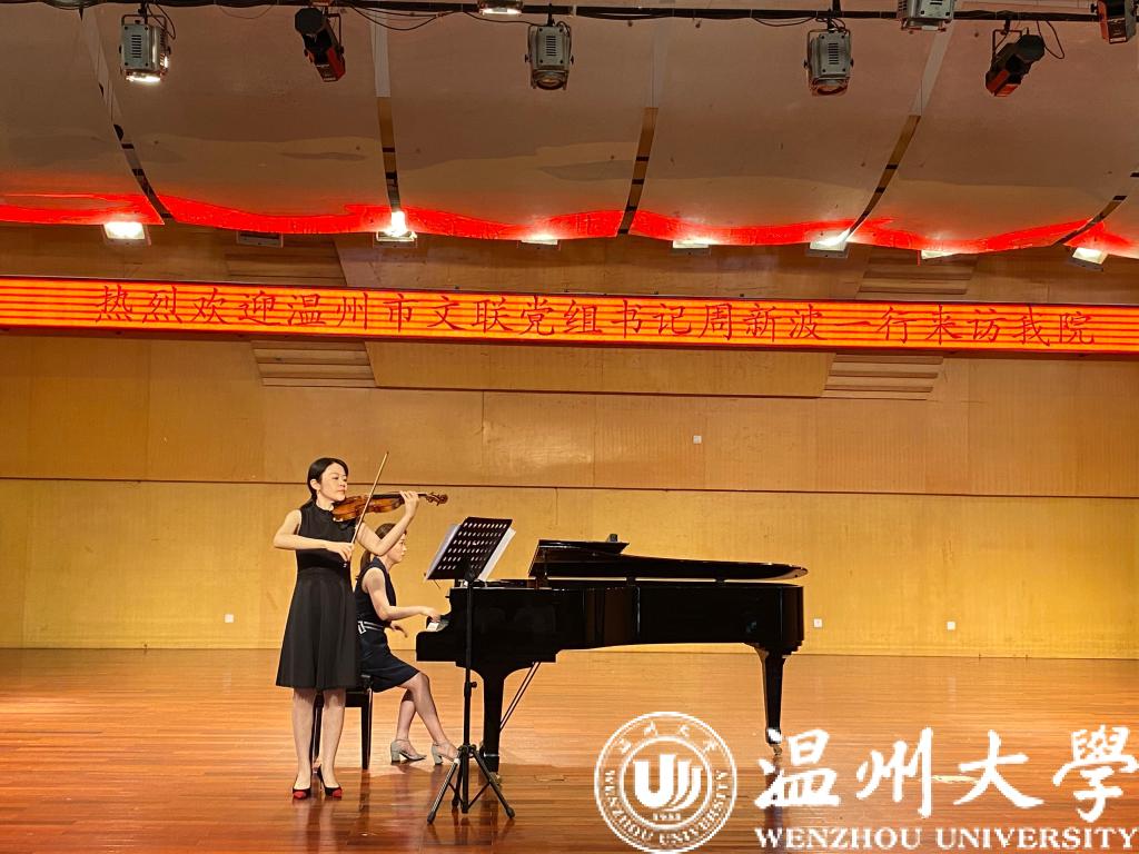 邹跃飞院长代表学院对周新波一行表示热烈欢迎,并邀请参行人员一同前往音乐厅观赏我院蒋乐乐、陈露雯两位博士合奏曲目《莫扎特G大调小提琴奏鸣曲K301第一乐章》。
