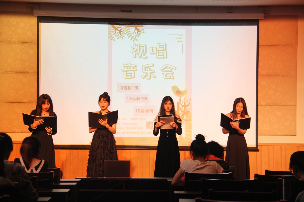 教学实践周活动继续进行,“18级学生视唱音乐会”如期在音乐楼201举行。本次音乐会采用的是线上线下混合的形式,而且使用的是视唱的演唱方式,所以有一种别具一格的感觉。