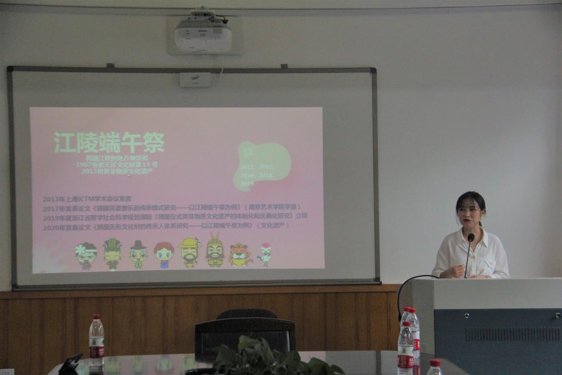 首先进行主讲的是钟芳芳老师,钟芳芳老师曾经在韩国读博士,所以这次她以“韩国江陵端午祭”为引子,进而介绍韩国无形文化财体系,然后引用相关论文为例子为研究生们详细地分享撰写论文的大致框架与整体思路。她分享了她本人对于韩国文化财体系的学术研究,并对相关知识进行了普及推广,