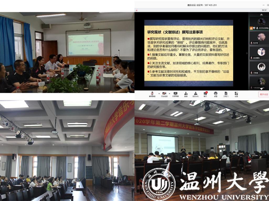 学院系列讲座有大学生科研课题申报辅导和考研政策宣讲与动员讲座。天瑞讲坛有《歌剧结构研究》和《韩国无形文化财的传承人体系研究——以江陵端午祭为例》两场专题讲座。音乐理论系教学观摩与研讨活动两场,民族五声调式的和声思维与实践和和声公开课。