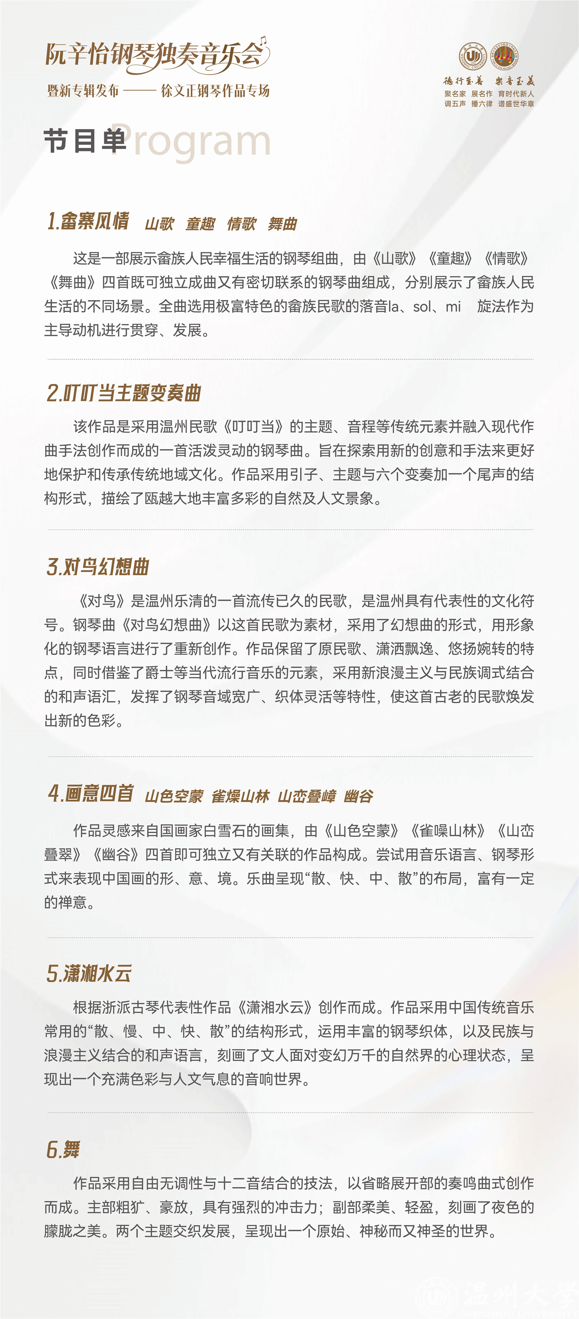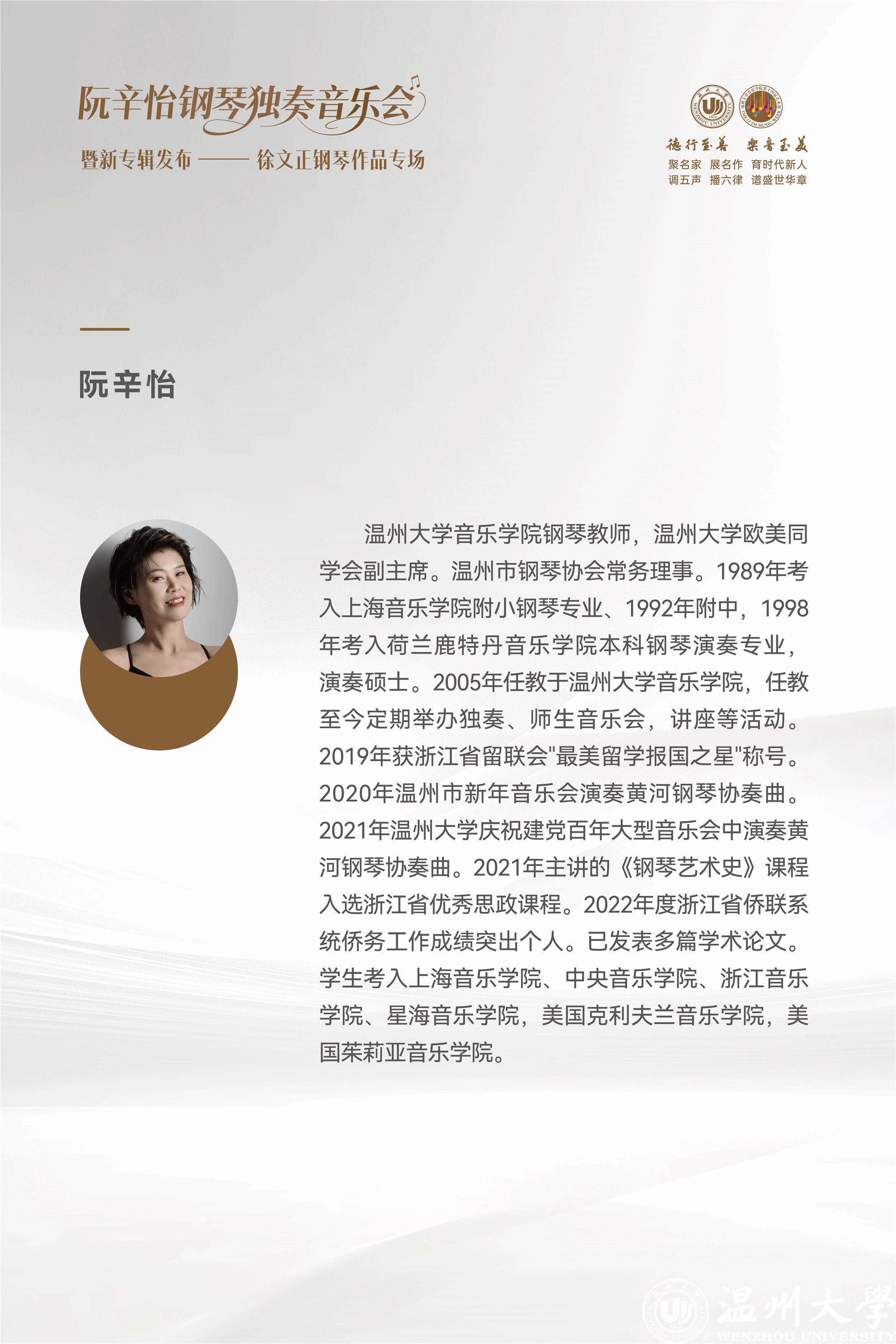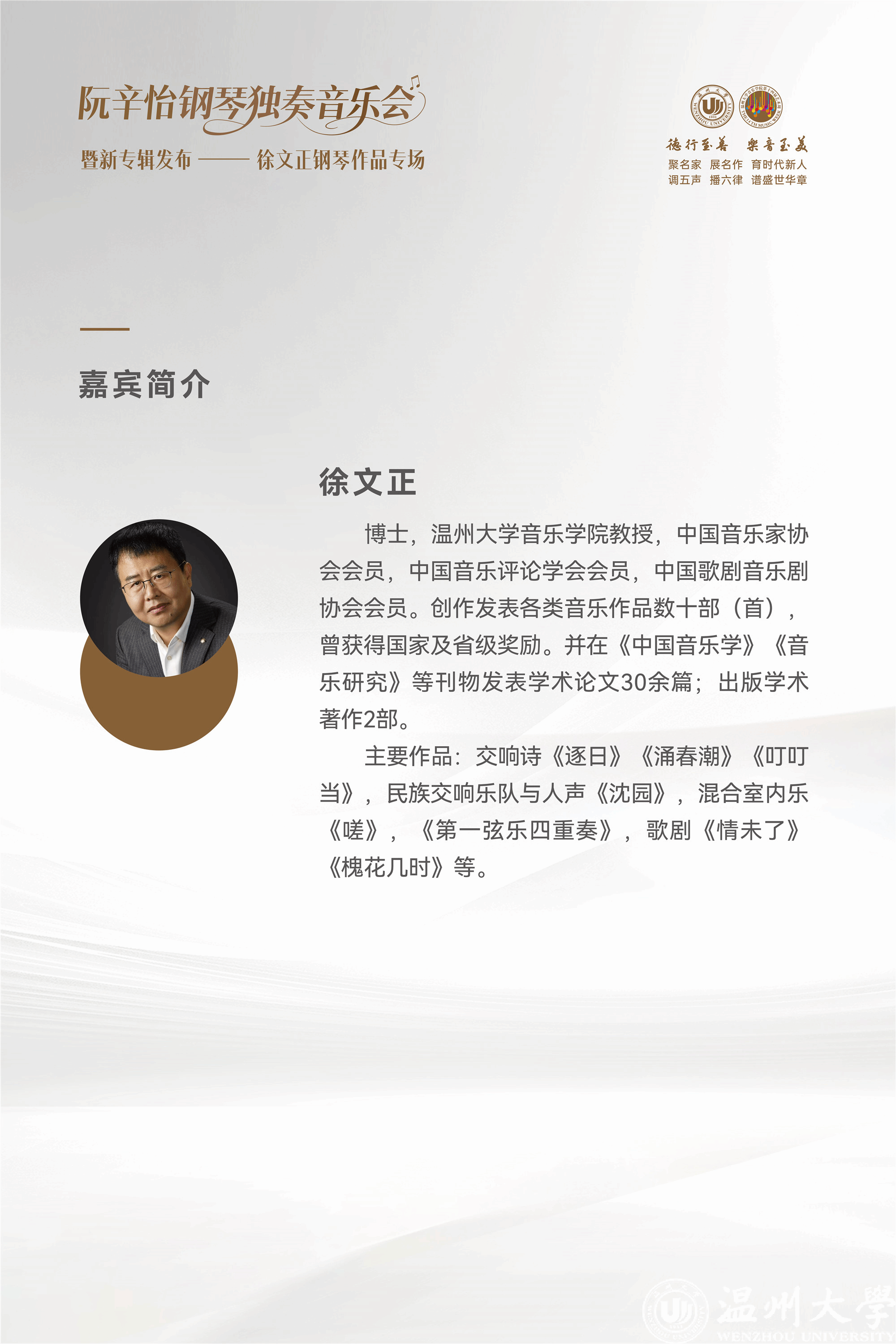举行“阮辛怡钢琴独奏音乐会暨新专辑发布——徐文正钢琴作品专场”。音乐会上,《叮叮当》《对鸟》等脍炙人口的温州民歌,以及浙派古琴名曲《潇湘水云》,首次以完整的钢琴独奏曲形式与观众见面。