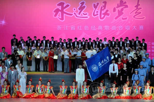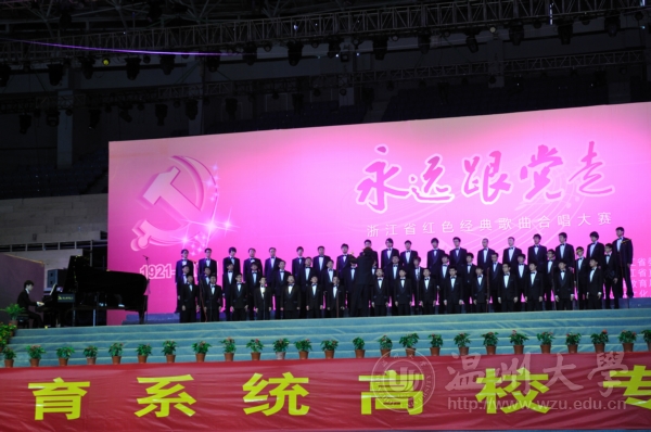 6月23日,由省委宣传部、省教育工委等六部门共同举办的“永远跟党走”——浙江省纪念建党90周年大合唱比赛在杭州隆重举行。我校男声合唱《天路》喜获一等奖。这是我校继全国艺术展演金奖、世界合唱节锦标赛金奖,中国合唱节比赛金奖后,获得的又一个艺术大奖。