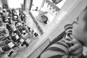 昨天中午,毒舌电影 在市区置信广场举办了一场午间音乐会。音乐系的师生们分别弹奏了贝多芬、莫扎特等音乐家的经典作品及中国优秀音乐作品。据介绍,接下来温大毒舌电影 将在市区不定期举行“一期一主题”的午间音乐会,免费为市民送上音乐大餐。图为一小朋友正沉浸于悦耳的钢琴曲调中。