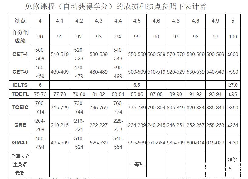 七、免修课程(自动获得学分)的成绩和绩点兑换表