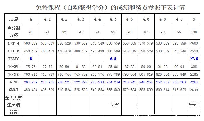1.CET-4成绩500分、CET-6成绩450分、雅思成绩6.0分、托福成绩75分、托业成绩700分、GRE成绩204分、GMAT成绩480分及以上者可申请免修大学外语必修课程。