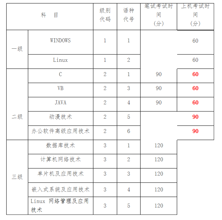 (六)三级:实行理论笔试,时间为120分钟。共有数据库技术、计算机网络技术、单片机及应用技术、嵌入式系统及应用技术、Linux网络管理及应用技术五个考种。