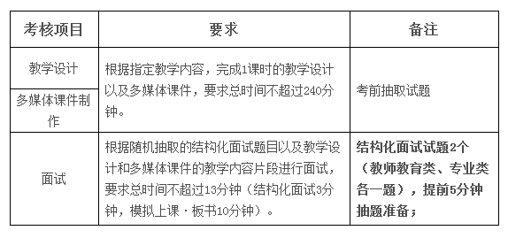 师范生教师职业技能考核评价标准(试行)》(附件2)进行集体评分。考核总分为100分,其中教学设计30分,课件制作20分,面试50分。总分及各单项分值均超过60%的为“合格”,总分或各单项分值低于60%的为“不合格”或“单项不合格”。
