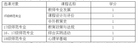 师范类专业本科人才培养方案,从15级开始全面放开选课,要求学生对教师教育类公共选修课必须修满6学分。根据培养方案课程设置,2018-2019-2学期开设的教师教育类公共选修课如下附表: