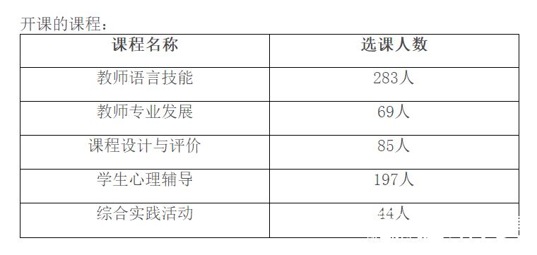 教育学院面向师范专业开设教师教育类选修课选课工作已经结束,教育学院将根据每门课程的选课人数重新安排课程。另外,选课人数少于30人不开课。现将选课结果公布如下: