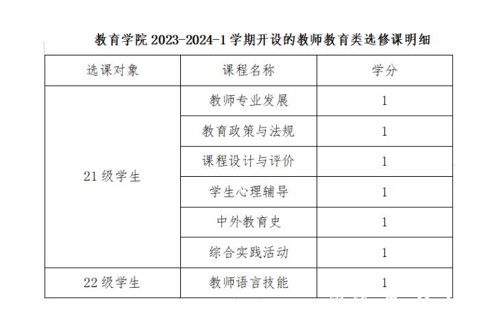 师范类专业本科人才培养方案要求,师范生需修读教师教育类任选课,21级、22级学生需修满3学分(具体以各自专业的培养方案为准);其他非师范类专业学生请查看各自专业的培养方案确定是否需修读该类课程。师范生的该类课程设置分为教育学院面向全校师范专业统一选课开设及学生所在学院专业内独立选课开设两类。现开展教育学院教师教育类任选课选课工作,具体如下: