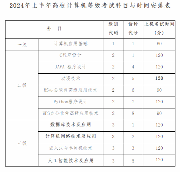 (六)三级:考试时间为120分钟。共有数据库技术及应用、计算机网络技术及应用、嵌入式与单片机技术、人工智能技术及应用四个科目,题型均为判断题(10%)、单选题(60%)和综合应用题(30%)。