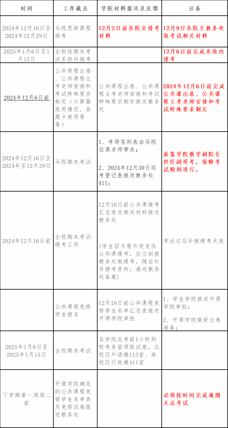 (四)公共课试卷于2024年12月6日前由各学院收齐统一送交教务处411。